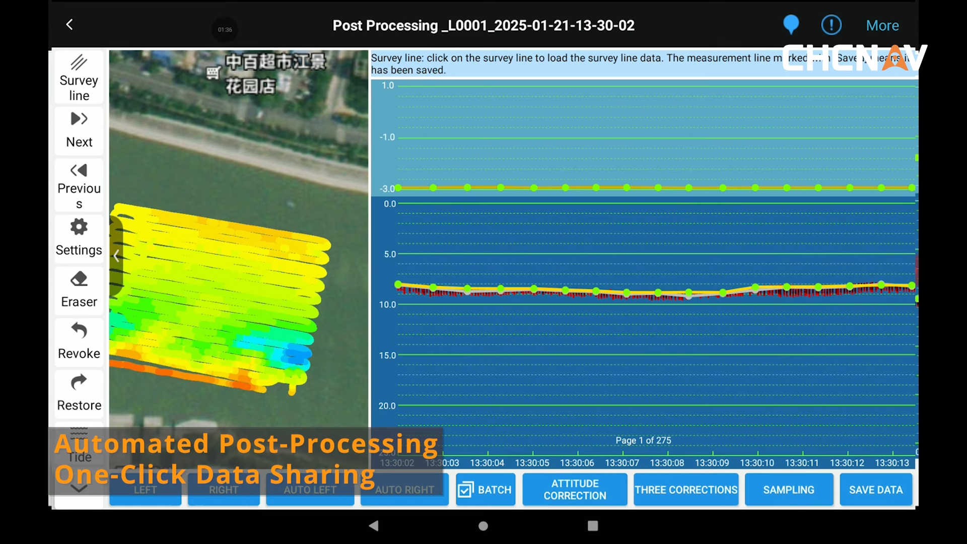 Während der Fahrt werden kontinuierlich Tiefendaten über das Echolot sowie Positions- und Lageinformationen aufgezeichnet. Die Datenübertragung erfolgt in Echtzeit, sodass der Bediener den Fortschritt überwachen und bei Bedarf Anpassungen vornehmen kann. Die stabile Sensorintegration sorgt dafür, dass Messfehler minimiert und konsistente Datensätze erzeugt werden – auch in dynamischen Gewässern.